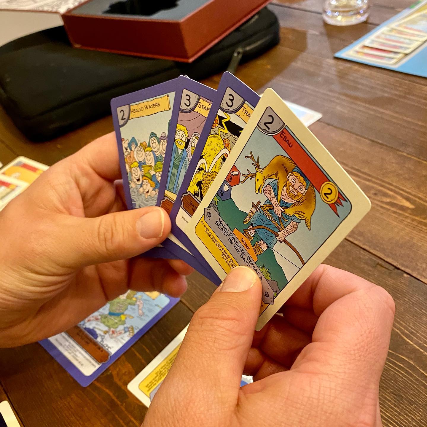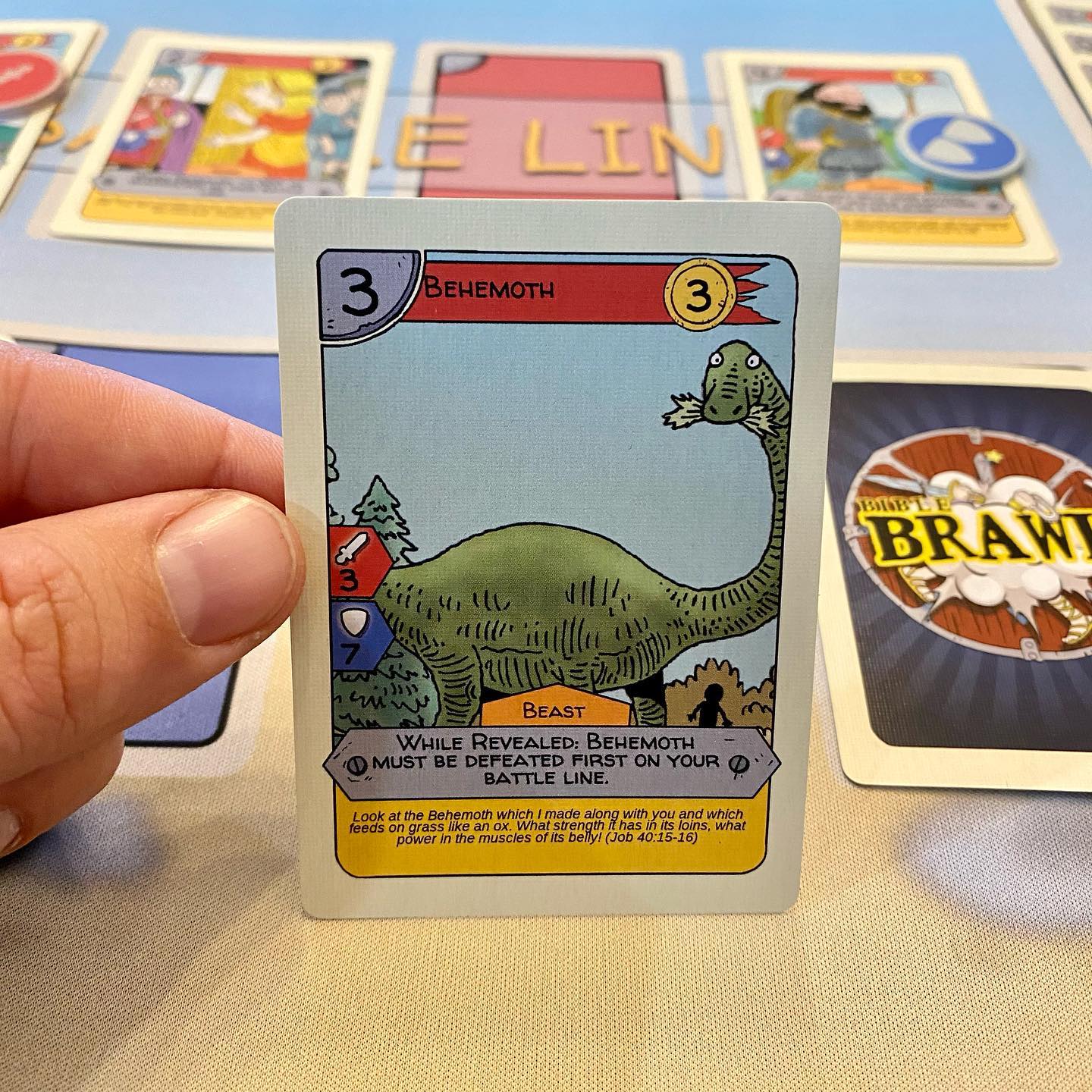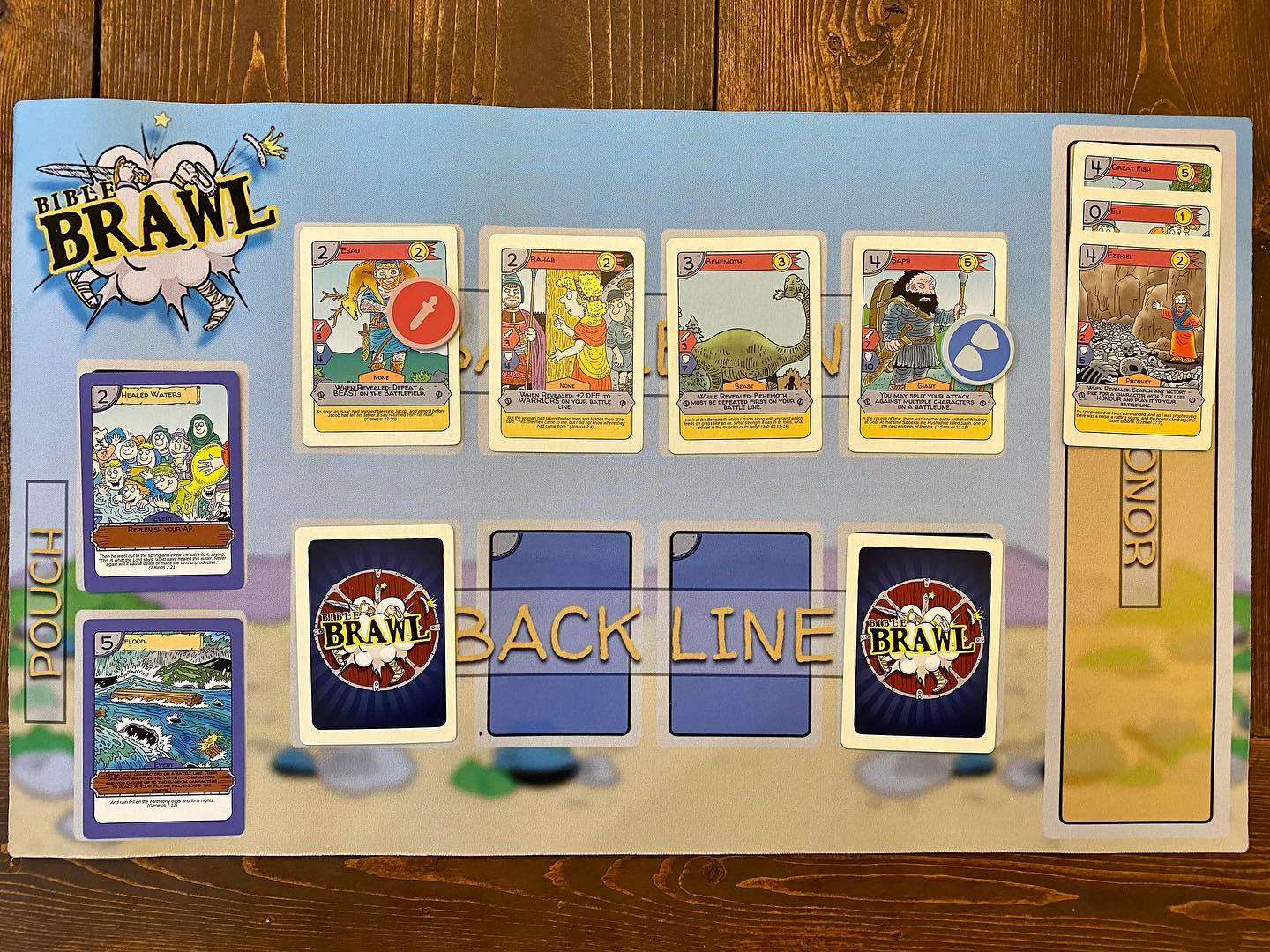 Bible Brawl is a 2-5 player card where players battle with some of the most iconic and obscure Bible characters to try and win the most honor.